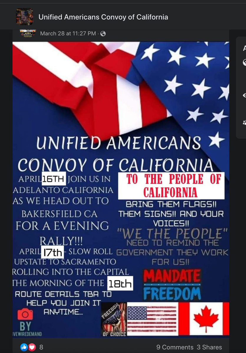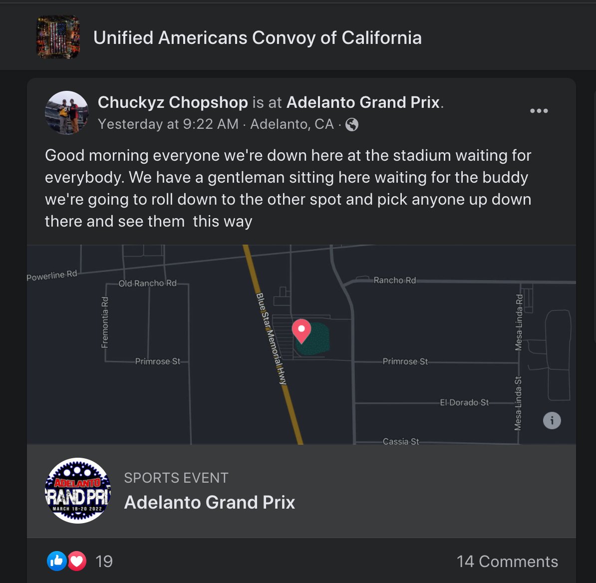 Cali convoy update- one of the local groups I've been keeping an eye on is the Unified Americans Convoy of California, run by Chuckyz Chopshop. Their convoy was supposed to kick off yesterday. It did not go well. 🧵 1 of n