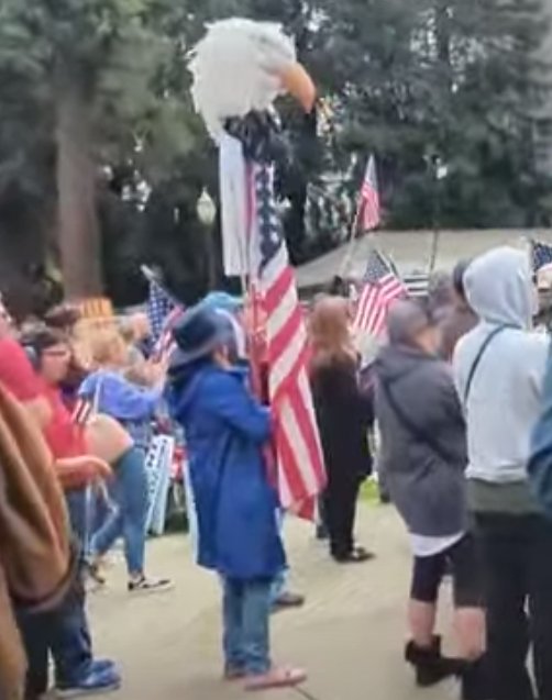 I'm not covering the content of the anti-vaxx rally, it's all standard (and incorrect) stuff with calls for violence scattered through it. However, I did see something new and unusual (to me)- a bald eagle head on top of a flag pole. 22 of n