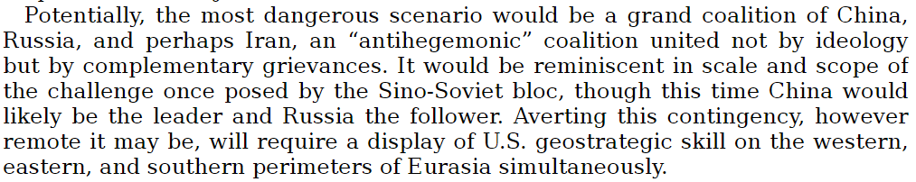 به عبارت دیگر اگر روسیه خود را از غرب بیرون بکشد و در خاورمیانه و آسیای شرقی و مرکزی کنترل بدست آورد، یا، اتحادی با چین (که بدون شک امروزه بازیگر اصلی شرق است) تشکیل دهد، آنگاه هژمونی جهانی آمریکا بطور جدی در معرض خطر است.