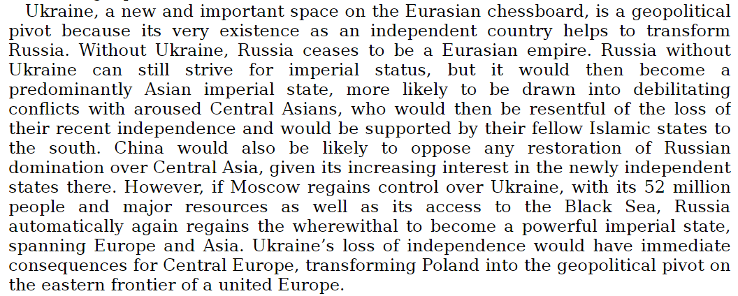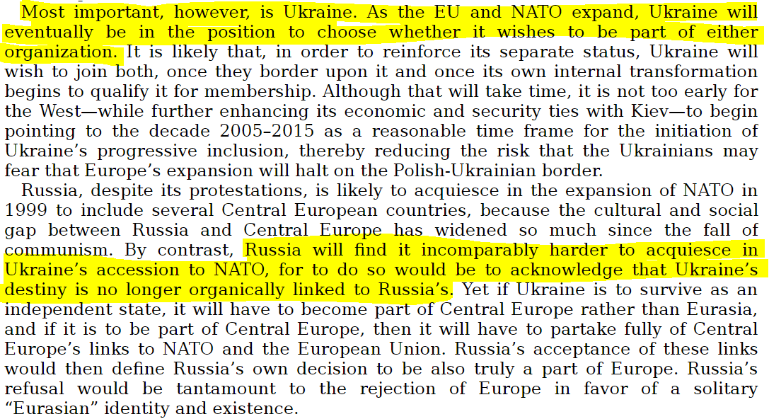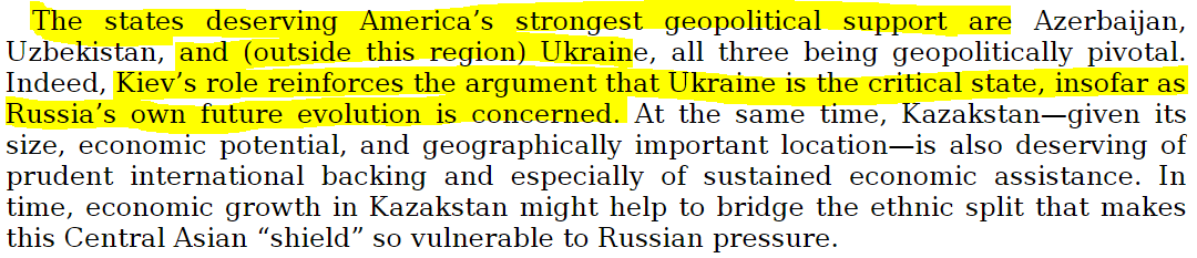 او تا آنجا پیش میرود که میگوید اوکراین یکی از سه کشوری است که باید «قویترین پشتیبانی ژئوپولیتیک آمریکا» را دریافت کند. و اینکه «تا جایی که آیندهٔ تحولات روسیه مد نظر است، اوکراین کشوری با اهمیت حیاتی است».