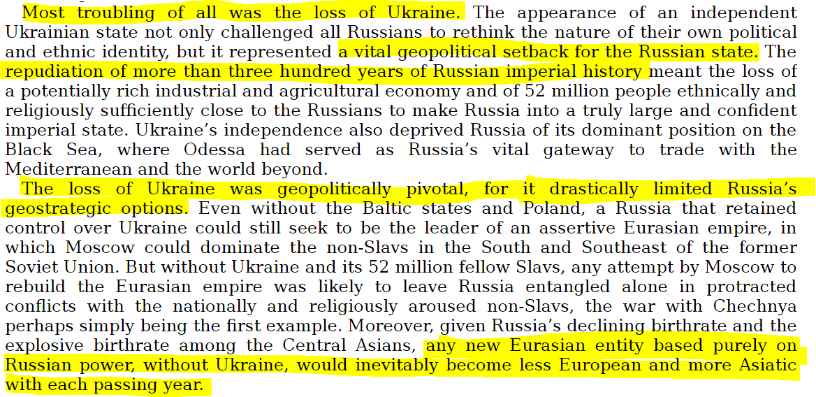 او «از دست دادن اوکراین» پس از «بیش از سیصد سال تاریخ امپراتوری روسی» را یک «عقبگرد حیاتی ژئوپولیتیک برای کشور روسیه» میخواند. چون این روسیه را «با گذشت هر سال» محکوم به «کمتر اروپایی و بیشتر آسیایی شدن» میکند.