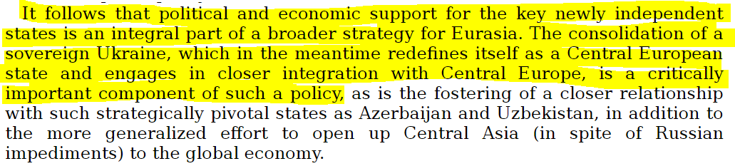 غیرمنتظره نیست که او این را چیز خوبی میبیند و مینویسد «بازتعریف اوکراین بعنوان یک کشور اروپای مرکزی» و اطمینان از «ادغام بیشترش با اروپای مرکزی»، یک «جزء حیاتی و مهم از استراتژی گستردهتر آمریکا برای اوراسیا» است.