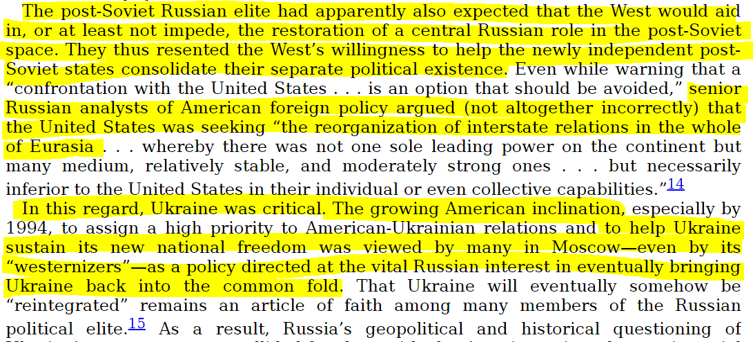 اگرچه او متوجه این هست که سیاست آمریکا در قبال اوکراین، بشدت برای روسیه حساسیتزا است و مینویسد «این از سوی بسیاری از افراد حاضر در مسکو –حتی غربگرایانشان- بعنوان سیاستی دیده میشد که منافع حیاتی روسیه را (در اینکه نهایتاً اوکراین را به جامعهٔ مشترک بازگرداند) هدف گرفته است»