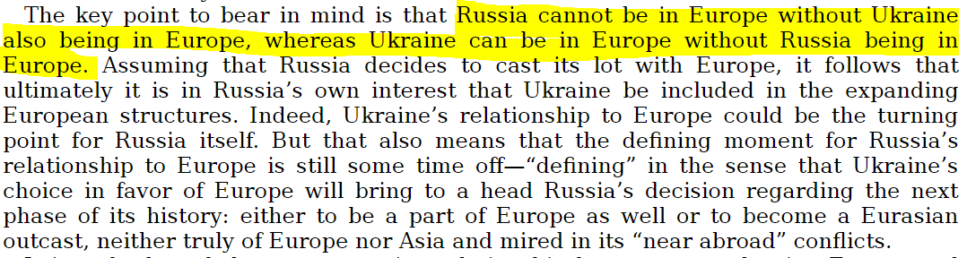 در هر حال او این را وسوسهبرانگیز میبیند، چون «روسیه نمیتواند در اروپا باشد بدون اینکه اوکراین هم در اروپا باشد، ولی اوکراین میتواند در اروپا باشد، بی اینکه روسیه در اروپا باشد»