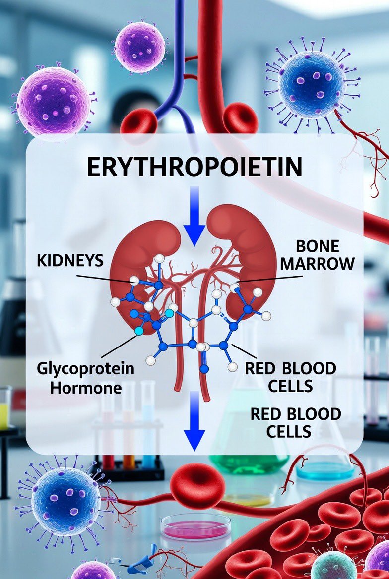 La eritropoyetina (del griego erythros “rojo” y poiein “hacer”) es una hormona glicoproteica (formada por azúcares y proteínas) que desempeña un papel esencial en la síntesis de glóbulos rojos.