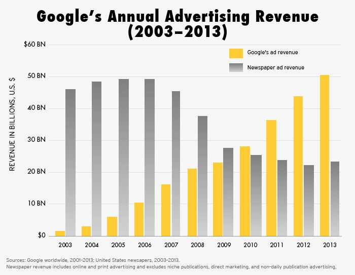 2005-2013+: Journalism is dead (esp local news), which was heavily reliant on classified ads. Why? Classified ads happen to be hyper-targeted, high-intent ads also known as "direct response". Facebook & Google do that too — more effectively, cheaply, and globally
