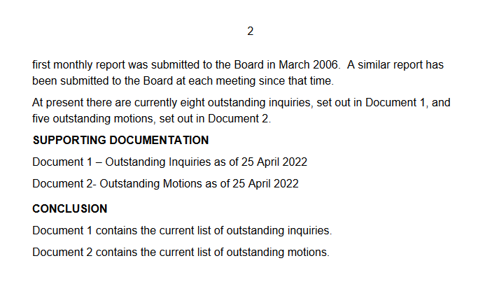 Item 16. Outstanding Board Inquiries & Motions Aprill 2022