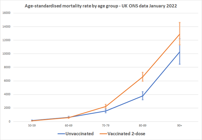 Janvier 2022, tous ces groupes d'âge ont taux mortalité + élevé dans le groupe vacc 2 doses que dans le groupe non vacc