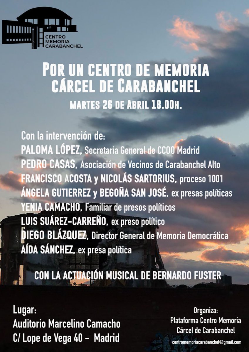 El próximo 26 de abril en el salón de actos Marcelino Camacho, de CCOO en Madrid, se celebrará un acto organizado por la Plataforma por el Centro de Memoria Cárcel de Carabanchel, con presencia de expresos, expresas y familiares.