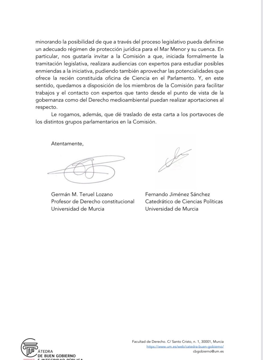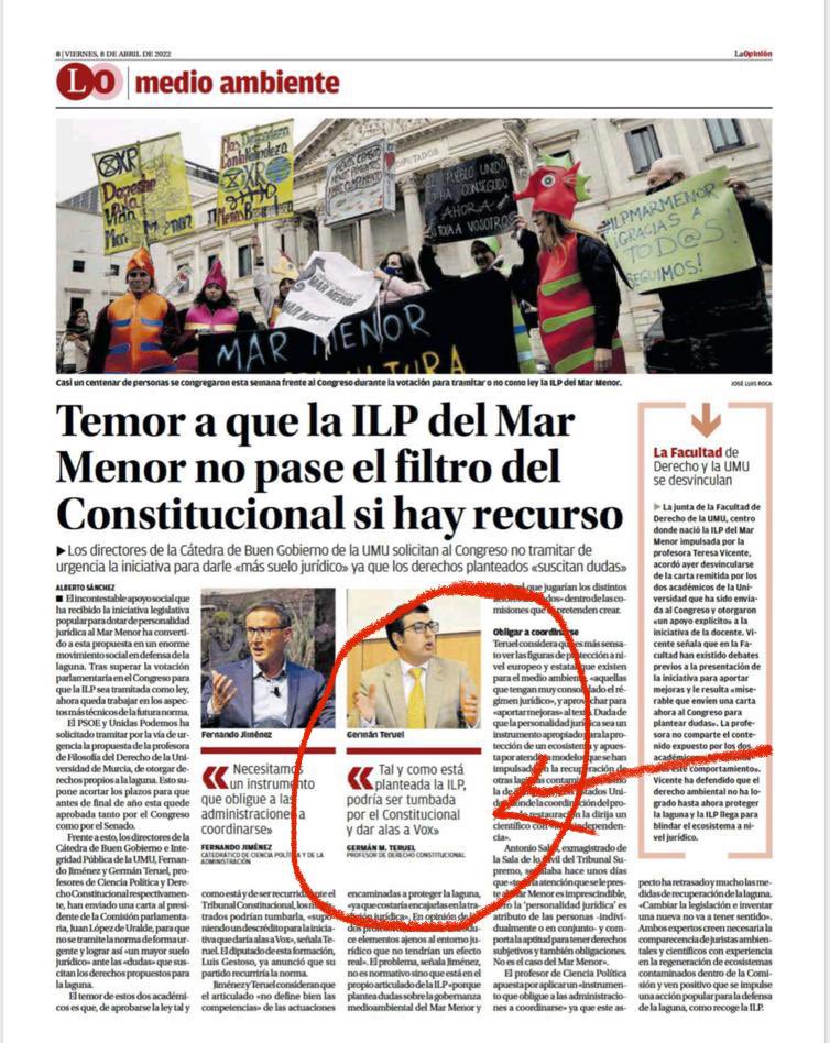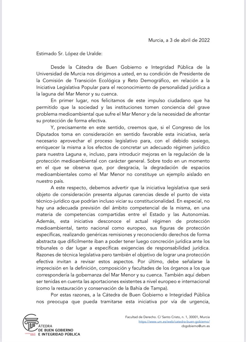 Hoy , es la propia Universidad de Murcia quien desautoriza a todo el consenso progre y el monumental ridículo de toda la prensa progre que jaleaba la disparatada aprobación en el Congreso de la ILP del Mar Menor que cancelaba el estado de derecho en esta zona de España . HILO