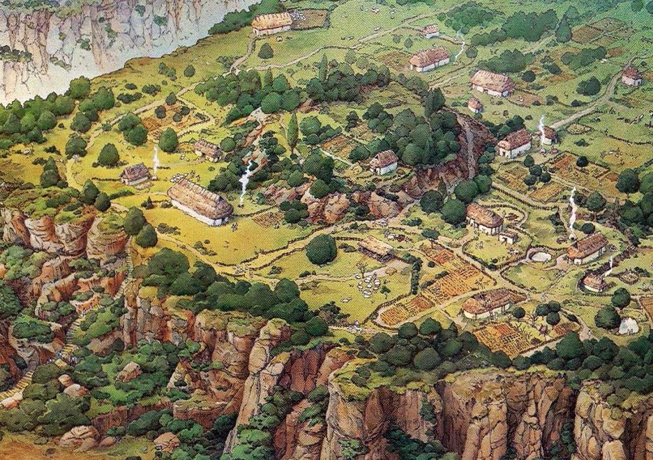 En este dibujo podemos ver una restitución ideal de como sería el monte Palatino en la época en la que la leyenda sitúa la fundación de Rómulo (s. VIII a. C.).