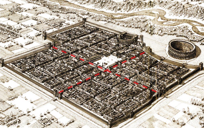 Finalmente se delimitaban las dos calles principales: el kardo de norte a sur y el decumanus, de este a oeste, así como un foso de protección y una muralla provisional de tierra que se sustituía paulatinamente por otra más duradera de piedra.