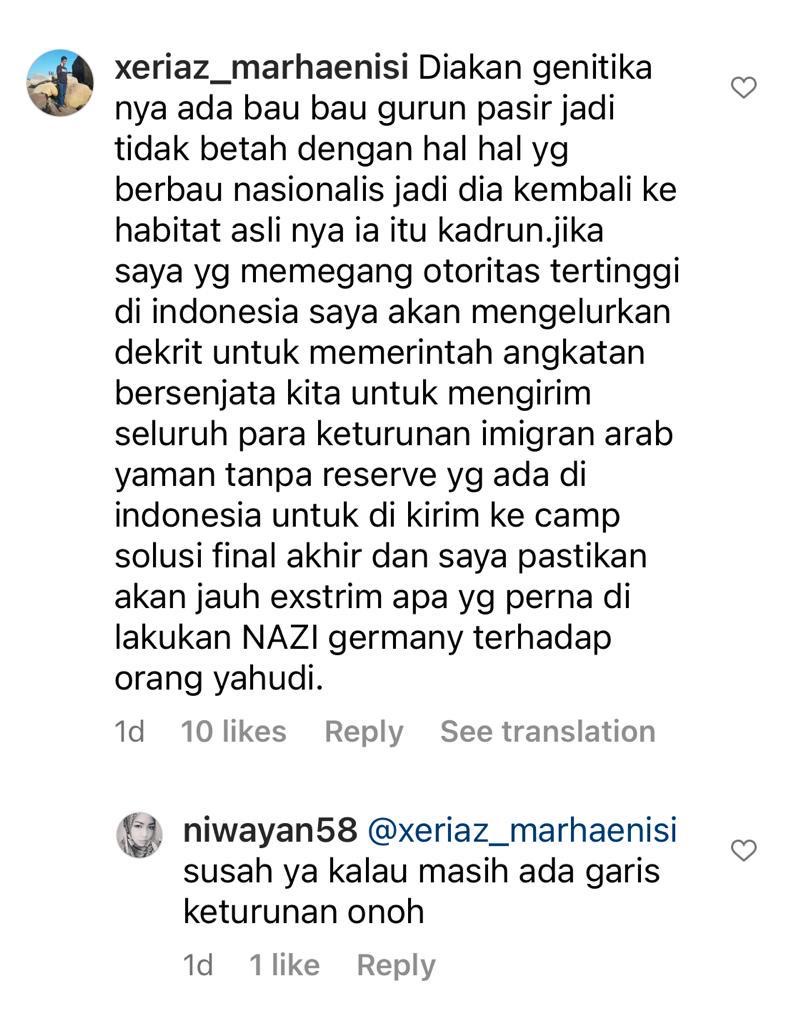 The guy wants to send us and all Hadrami Indonesians "who genetically cannot feel at ease with nationalism" to a "final solution" extermination camp "far more extreme than that of Nazi Germany". Alas racism is strong and thriving.