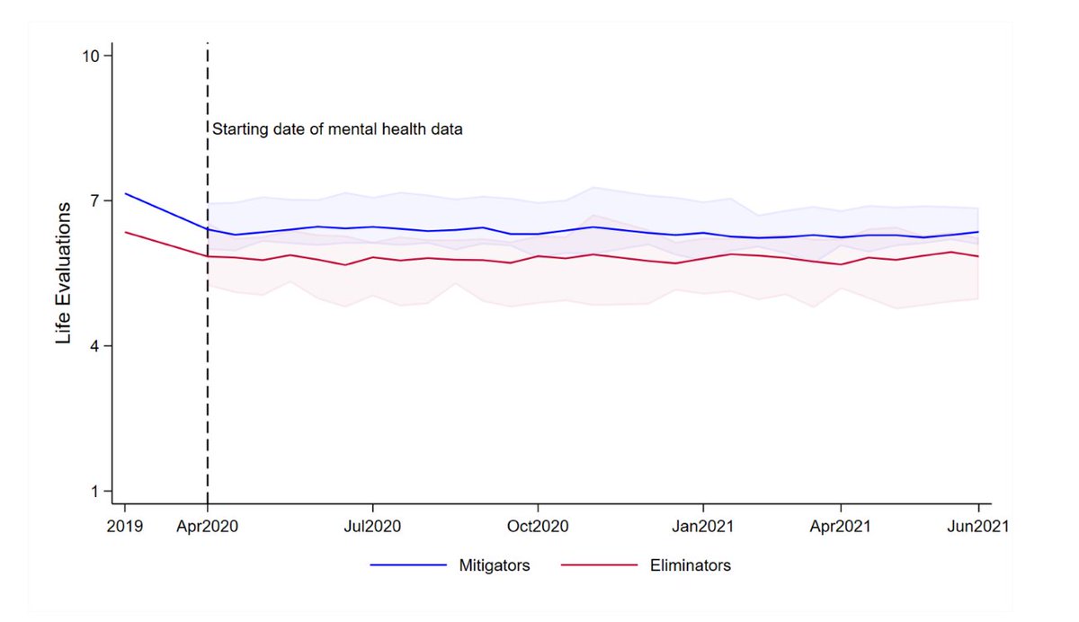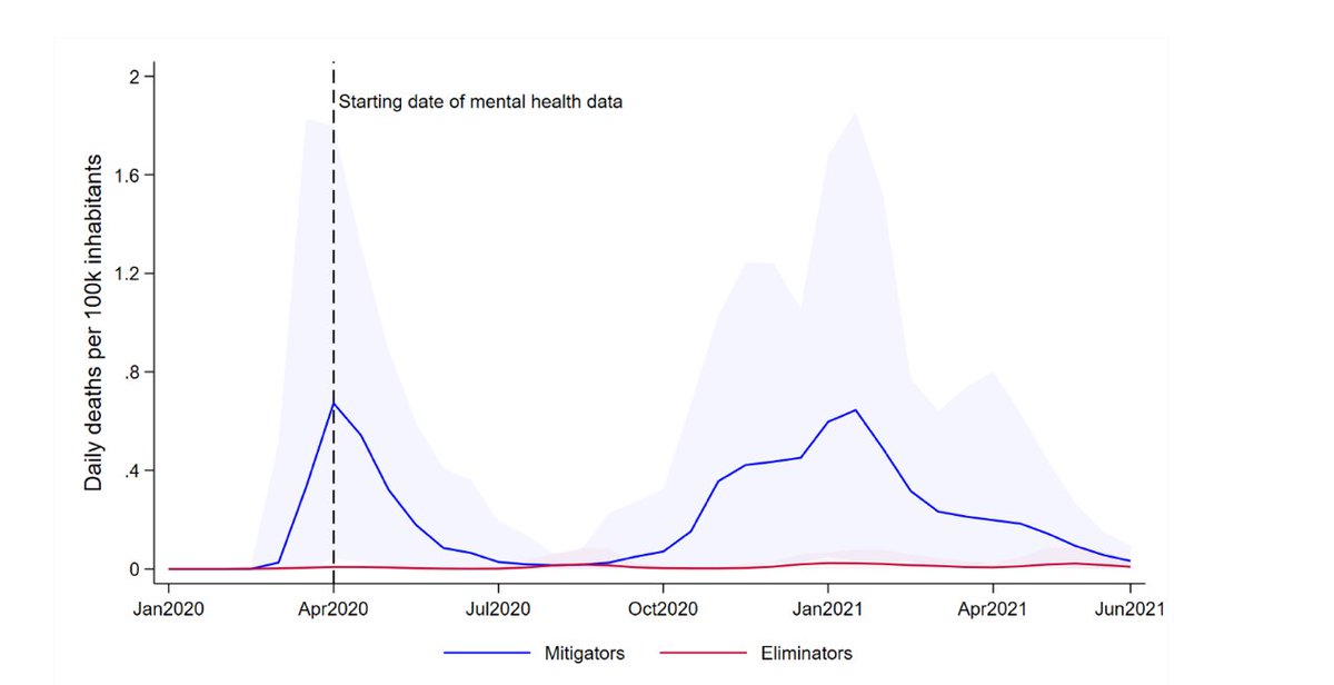 Finding 4: Eliminators used lower avg levels of policy stringency than mitigators and they adopted early and targeted action which led to lower levels of virus circulation. These countries had fewer deaths and more positive trends in mental health during the pandemic.