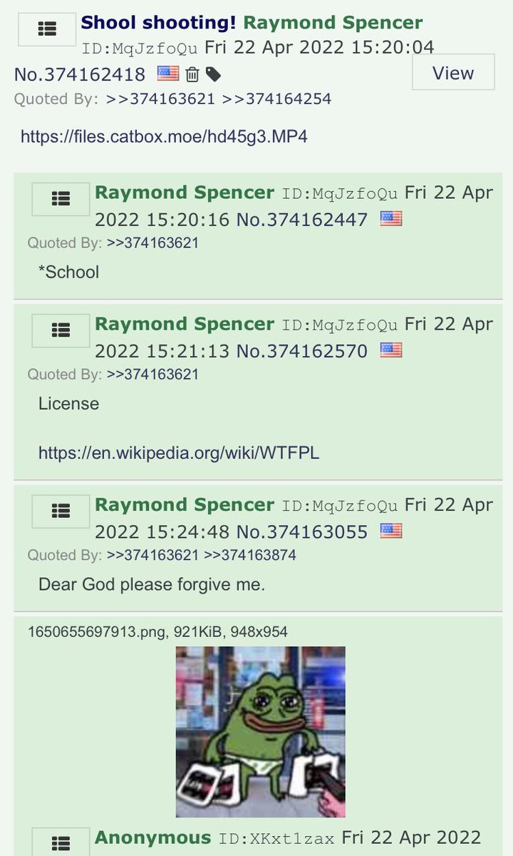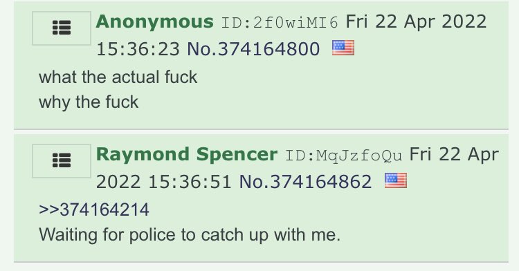 Police have confirmed the video on social media to be authentic and are seeking 23-year-old Raymond Spencer (the 4chan user posted above) as the person-of-interest hoping he will surrender himself.