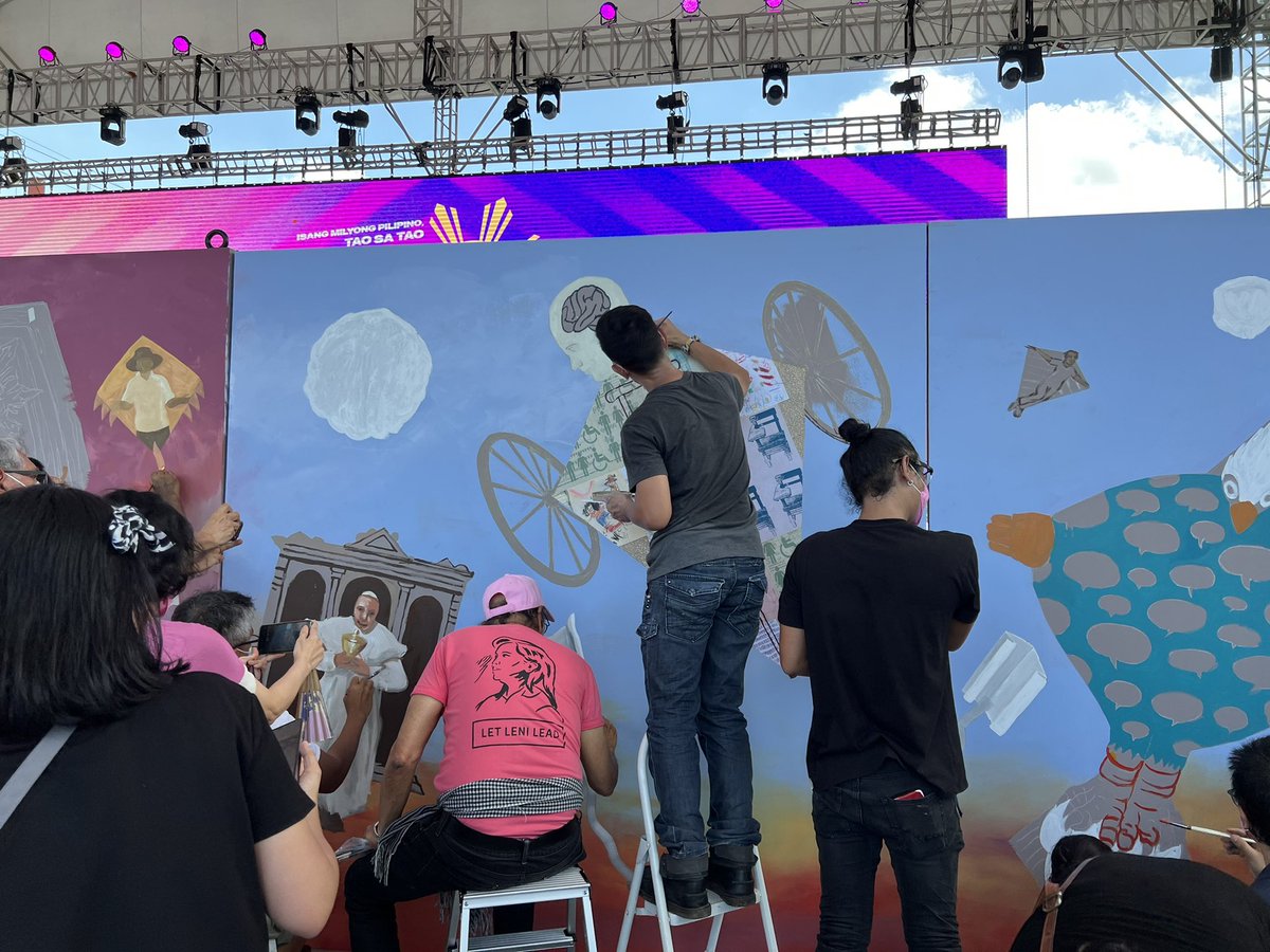 Before the program starts, several artists are working together onstag to complete this mural for Robredo’s birthday rally. #PHVote
