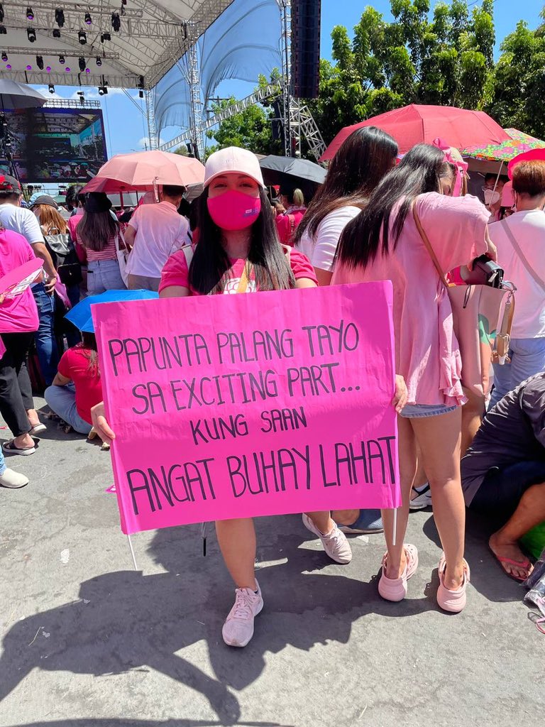 It feels like a music festival here. Energy of the “Kakampinks” is palpable, even if they are enduring the sweltering heat. As popular bands Moonstar 88 and Gracenote take the stage, Robredo supporters sing along to their hits. #PHVote