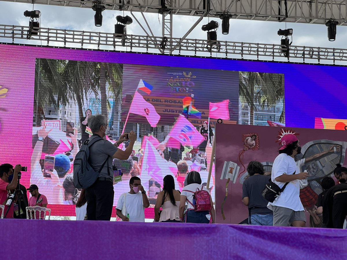 A series of Robredo ads are being played for the second time in the row here. We are told this is due to a technical problem as the tech/sound booth temporarily lost power. Despite the program interruption, “Kakampinks” wait for the program to resume. They are staying for Robredo