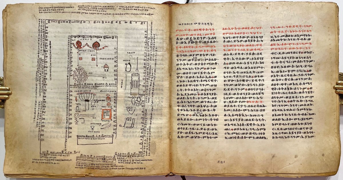 An 18th century Ethiopian Version of Kings, መጽሐፈ ነገሥት , which contains the two Books of Samuel and the two Books of Kings, together making up 1-4 Kings. THERE ARE TWO FULL-PAGE DIAGRAMS OF THE TABERNACLE AND THE ARK OF THE COVENANT, with many marginal annotations. 1/