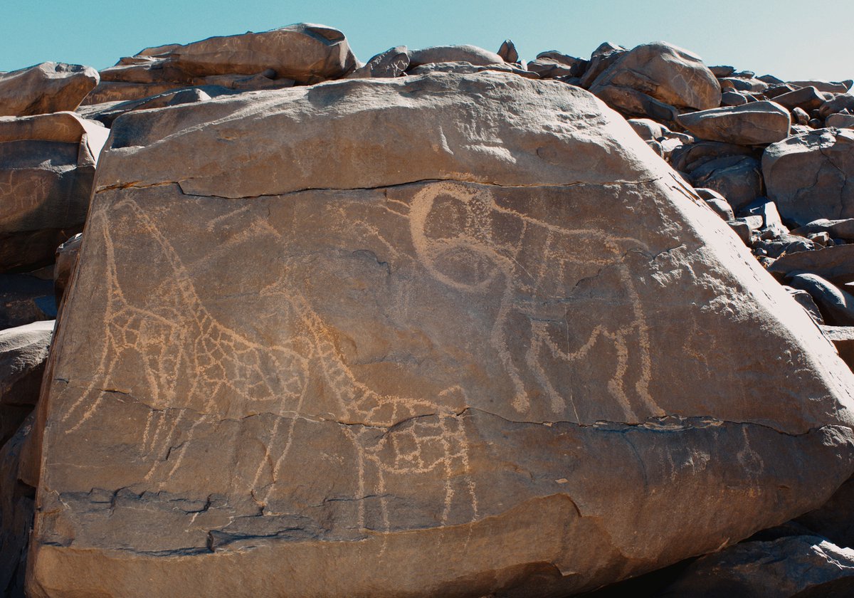 The giraffe carvings were first recorded by French archaeologist Christian Dupuy in 1987, and documented by David Coulson in 1997 while on a photographic expedition to the site. The carvings are 6 metres in height and consists of two giraffes carved into the Dabous Rock. 2/
