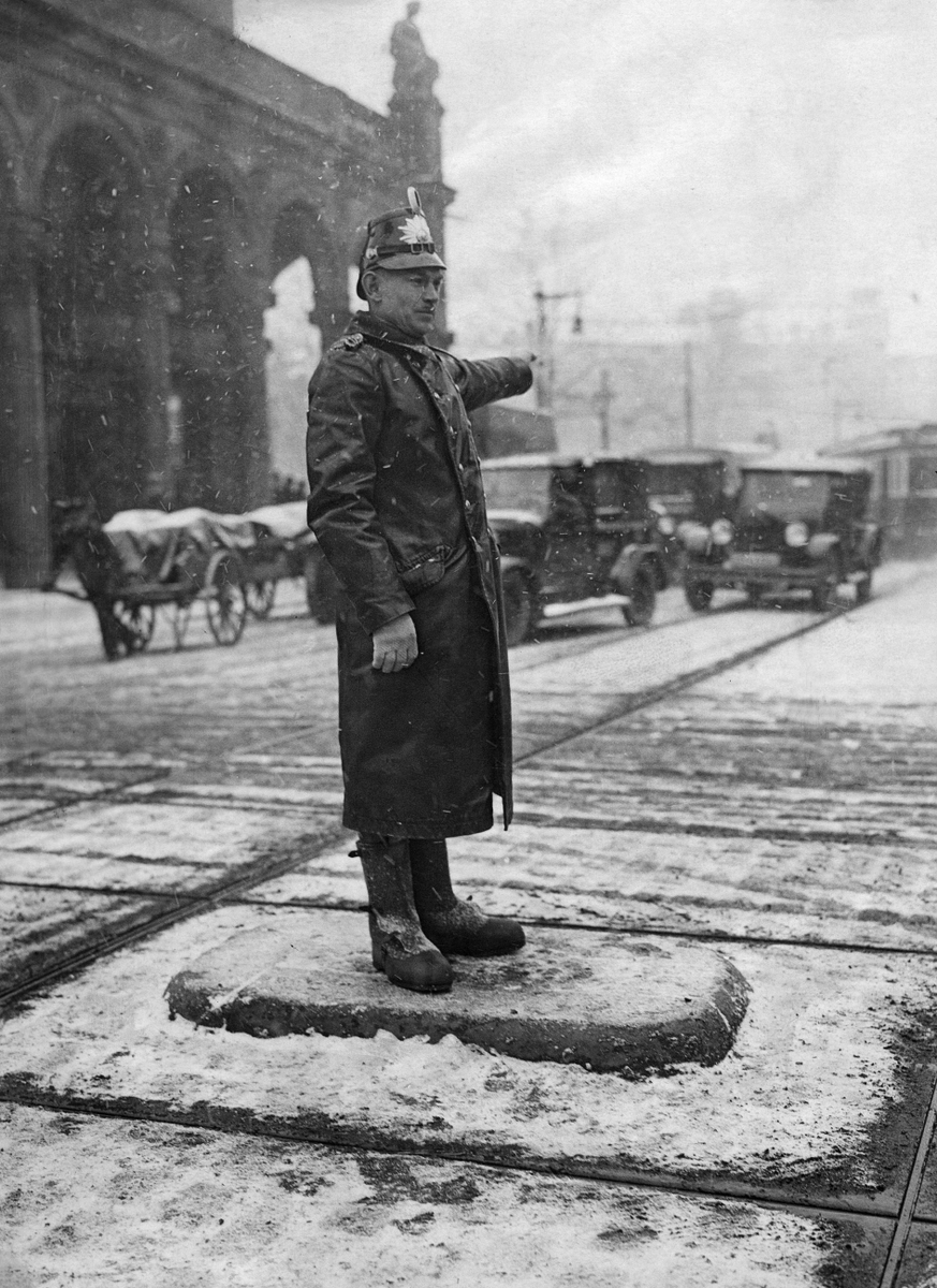 Um das in geordnete Bahnen zu lenken, standen Verkehrspolizisten vor der Einführung von Ampeln in der Mitte von Kreuzungen und taten das selbst.