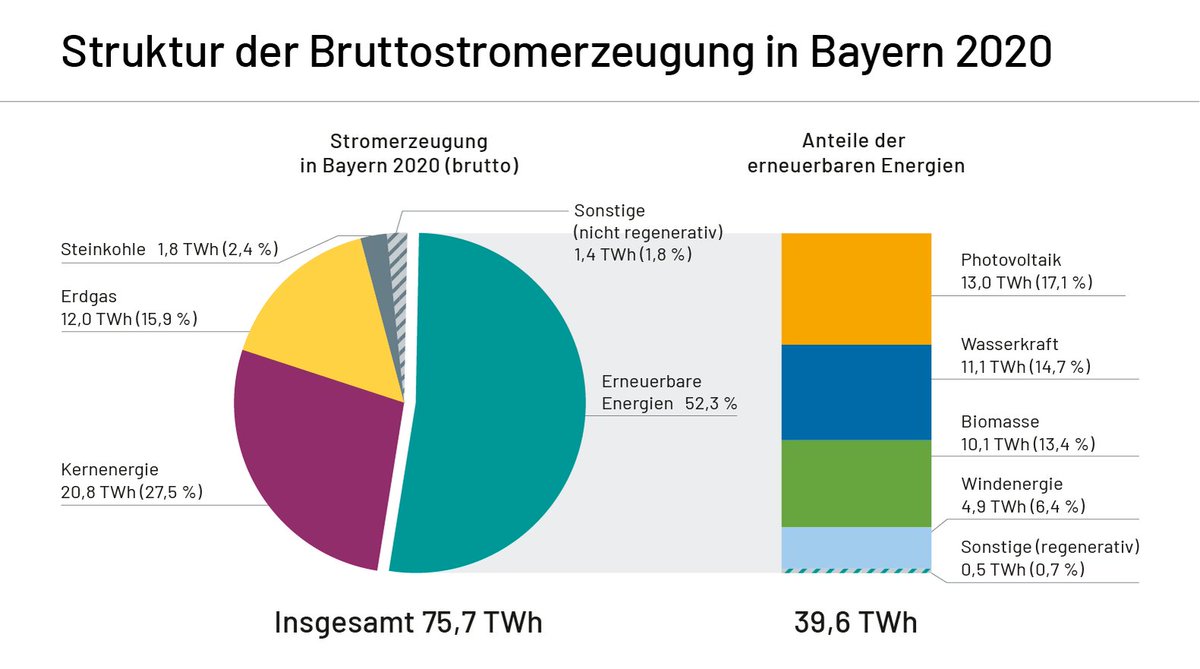 Der bayerische Strommix sieht gar nicht schlecht aus, 2020 lag der EE-Anteil leicht über dem deutschlandweiten Schnitt. Besonders die Photovoltaik lag mit 17% deutlich über den bundesweiten 10%, dafür lag Wind mit 6,4% deutlich unter dem deutschen Schnitt von 27%.