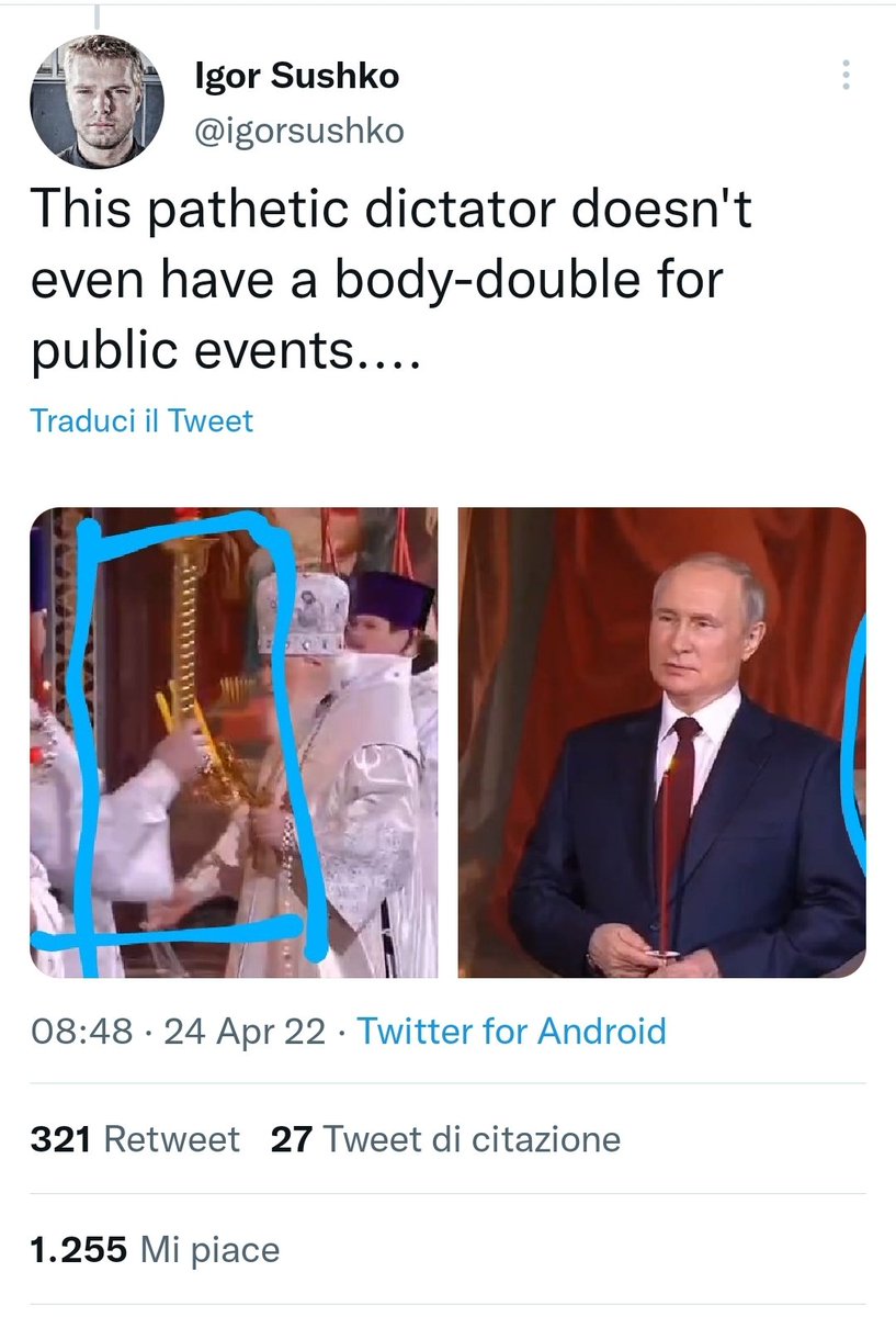 1/ Mi segnalano questo thread dove si sostiene che Putin non si trovasse affatto durante la messa di Pasqua. La teoria è quella del video pre-registrato e poi aggiunto nel montaggio. La cosa non mi convince affatto e ci sono delle lacune evidenti nell'analisi 🧵👇