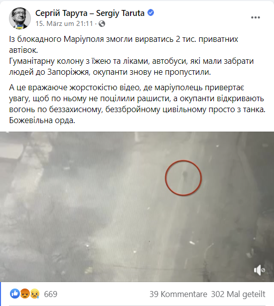 This video, circulated by the Mariupol city deputy and others, allegedly showing a Russian tank firing at a man at close range, is a fake.