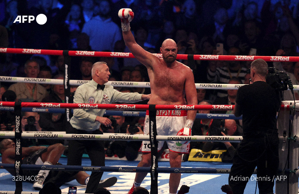 #UPDATE The unbeaten Tyson Fury floored his opponent with a sixth-round uppercut in front of 94,000 fans at Wembley in London #AFPSports#FuryWhyte