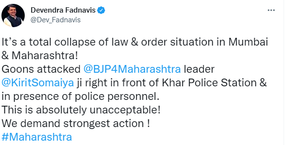 After leaving the Khar PS, BJP leader Kirit Somaiya tweets, "Heavy stone-throwing at Khar Police Station by Shiv Sena gundas (goons), my car window glass broken, I am injured, rushing to Bandra police station."