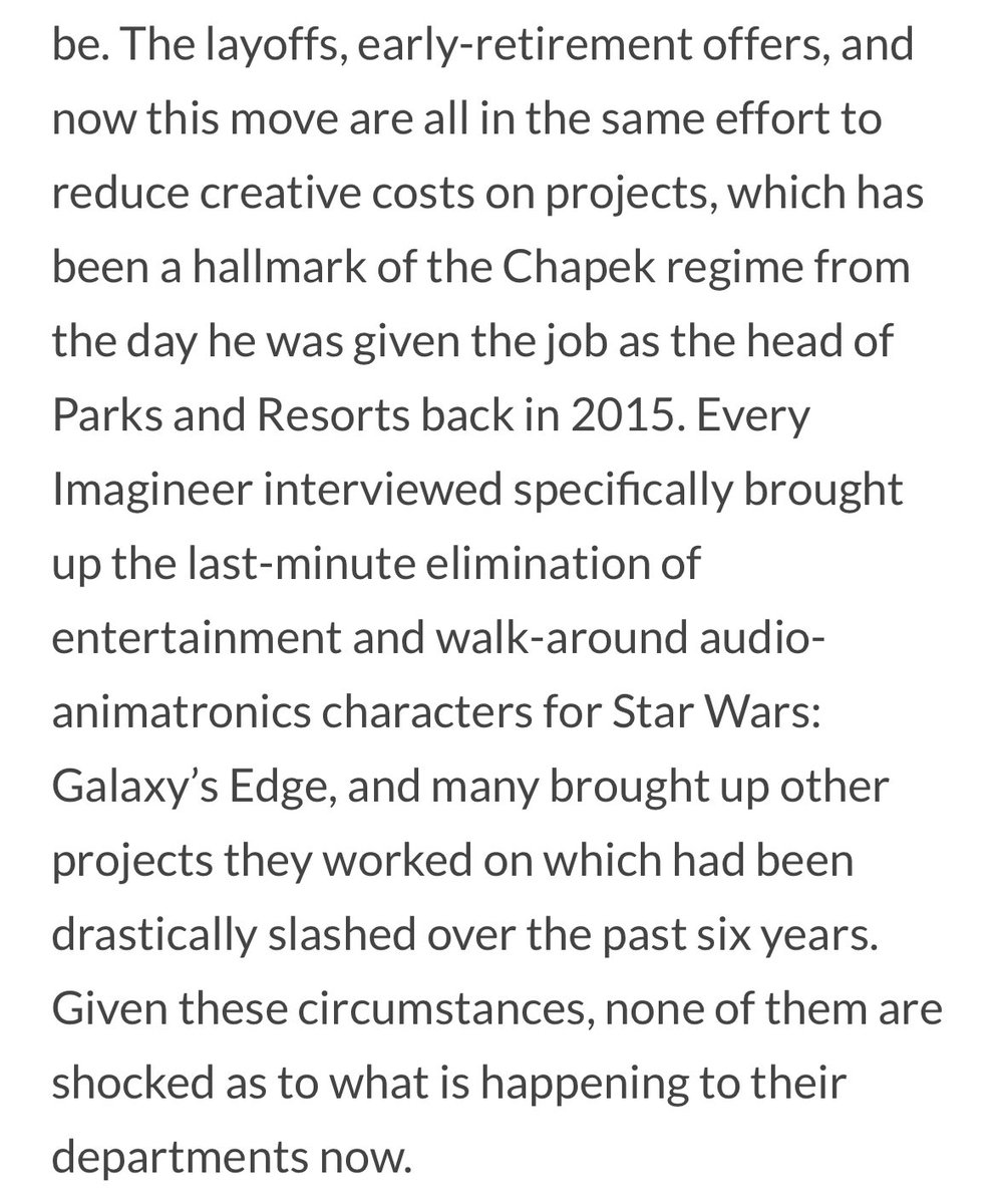 Chapek was already on the WDI shit list internally for cutting a ton of attractions for Star Wars Land that may have made it not suck so bad: a real "Cantina" with live music and a dinner show, animatronic Banthas walking around, tons of interactivity, etc. And now, well....
