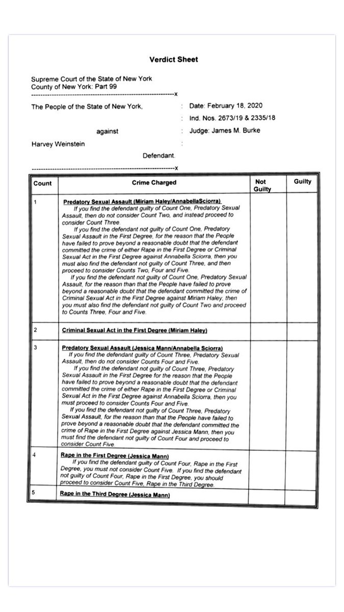 EXPLAINER: Now in day 4 of deliberations, the Weinstein jury must follow a specific path to decide the 5 charges, per Justice Burke. It’s a bit like a flow chart... so I made one to go with the verdict sheet. Here we go. @Law360
