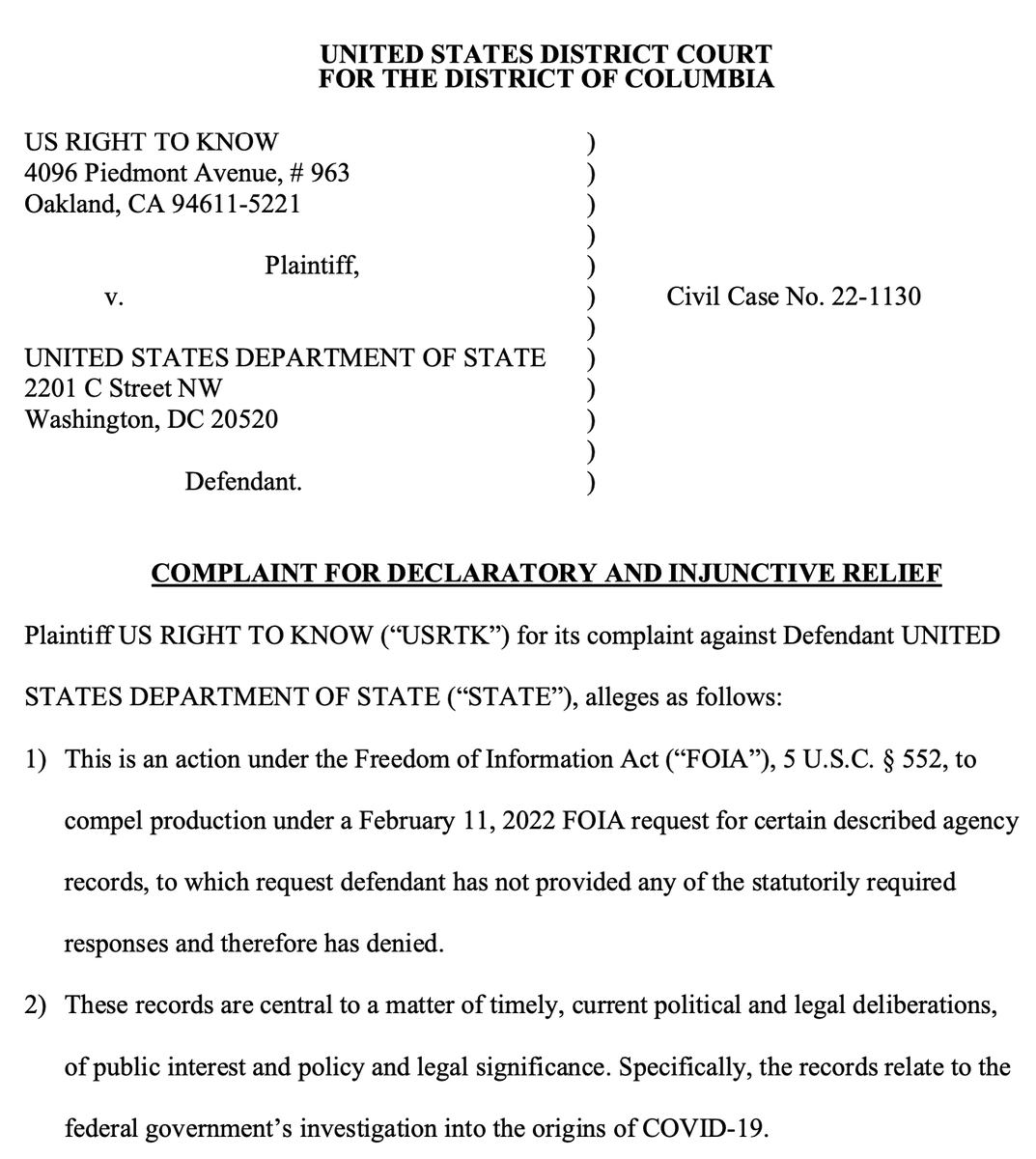 We have filed a #FOIA lawsuit against the @StateDept for documents related to a State Dept. investigation of the origins of Covid-19, the EcoHealth Alliance, gain-of-function research, dual use research of concern and the Global Virome Project. usrtk.org/wp-content/upl…