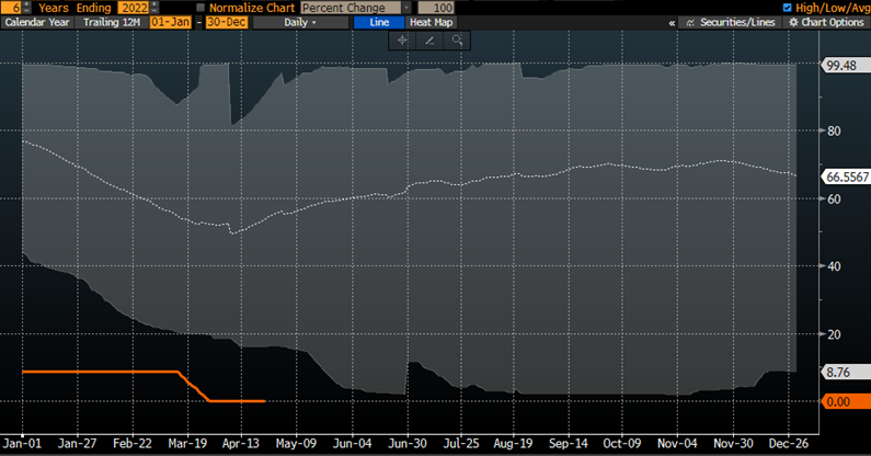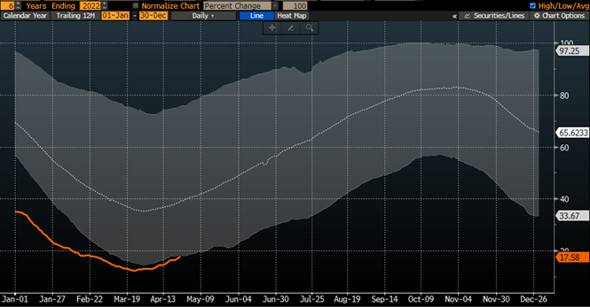 He will get his will. The UN Food and Agricultural Organisation estimates that 20-30% of sunflower, grains and corn will not be planted or harvested. It forecasts food prices to rise by another 8-22% because of the loss of Ukrainian production (FT, 9 April).