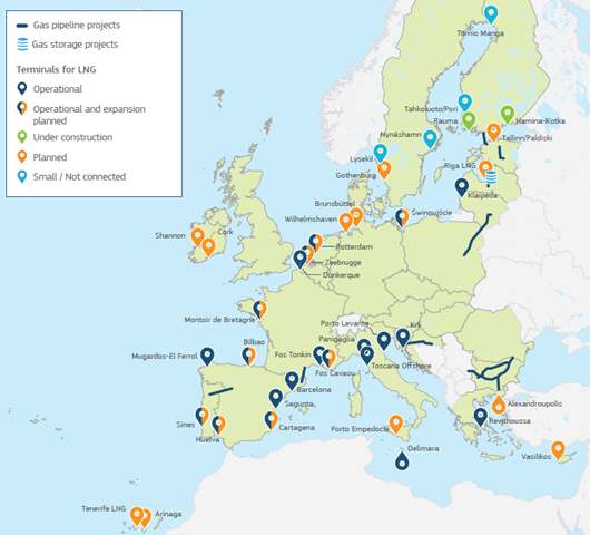 Which brings us to Germany which consumes 20% of (90-100bcm) of a total of 500bcm in the EU but it does have a single regasification terminal.