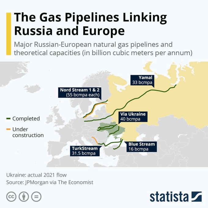 Answer: Europe purchased 150 billion cubic meters (bcm) of gas from Russia, imported from 3 pipelines & 15bcm in the form of Liquified Natural Gas (LNG) by sea.