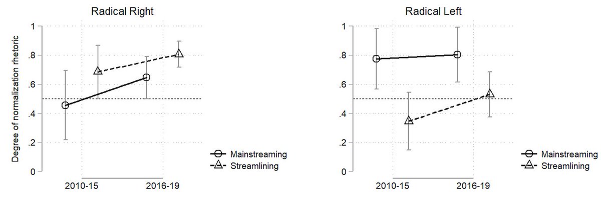 Over time, we observe shifts we would miss had we looked only at party positions. Yet, contrasting rhetoric with substantive ideas remains vital. Normalisation rhetoric didn't correlate with substantive moderation of party positions and differed for radical right and left. 6/