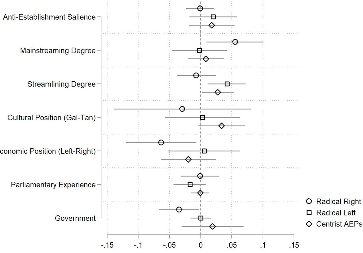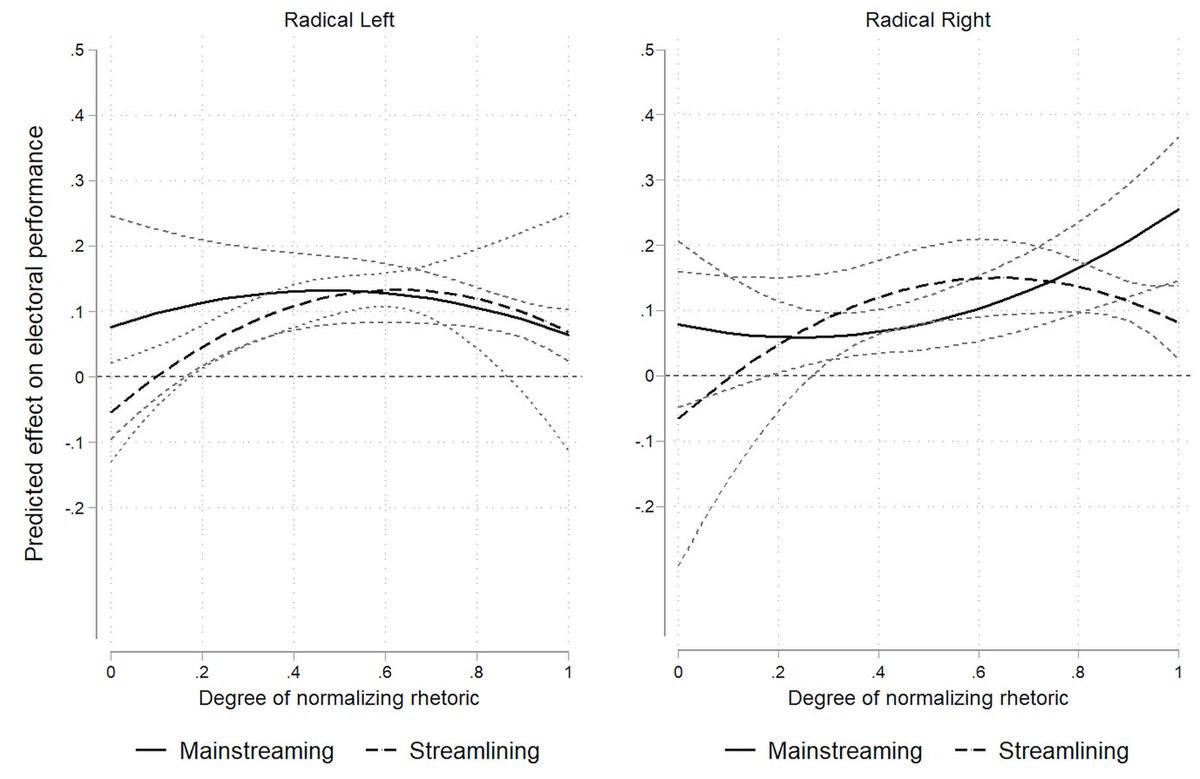 Note: these effects are not linear. AEPs rely on blurring to avoid appearing too far or too close to normal politics. Exception: unlike with streamlining, radical right parties profited most the more they could depict nativism as compatible with already valid mainstream values 8/
