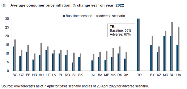 If there should be an EU energy embargo against Russia, inflation rates will be in double digits in almost all countries of CESEE. In #Russia inflation could reach 28% this year, in #Ukraine 25%. In #Turkey, inflation will be around 55% β even in the baseline scenario. 3/7