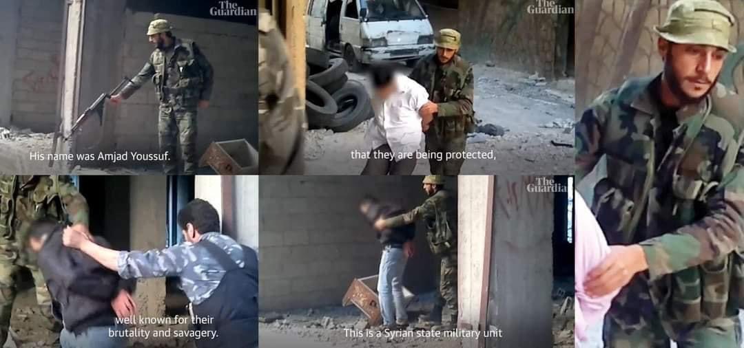 The Guardian'dan Martin Chulov'un anlatımı ve "Tadamon katliamı: Suriye gizli savaş suçu" başlığıyla paylaşılan görüntülerde, Suriye istihbarat görevlisi olan Amced Yusuf’un", gözleri bağlı ve kelepçeli şekilde gözaltına alınan ve koşmaları söylenen sivilleri vurduğu görülüyor.
