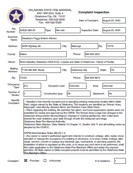 The Oklahoma State Fire Marshal report dates back to 2020, when a fire marshal agent, described as Agent Beebe, discovered their office had not received a permit for the new Foggy Bottom Kitchen restaurant at Roman Nose.