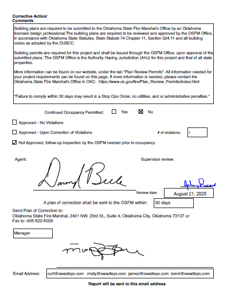 "... and permits outlined in the terms of the agreement, department staff immediately began work with the Oklahoma State Fire Marshal to ensure all restaurant locations were brought into compliance...."