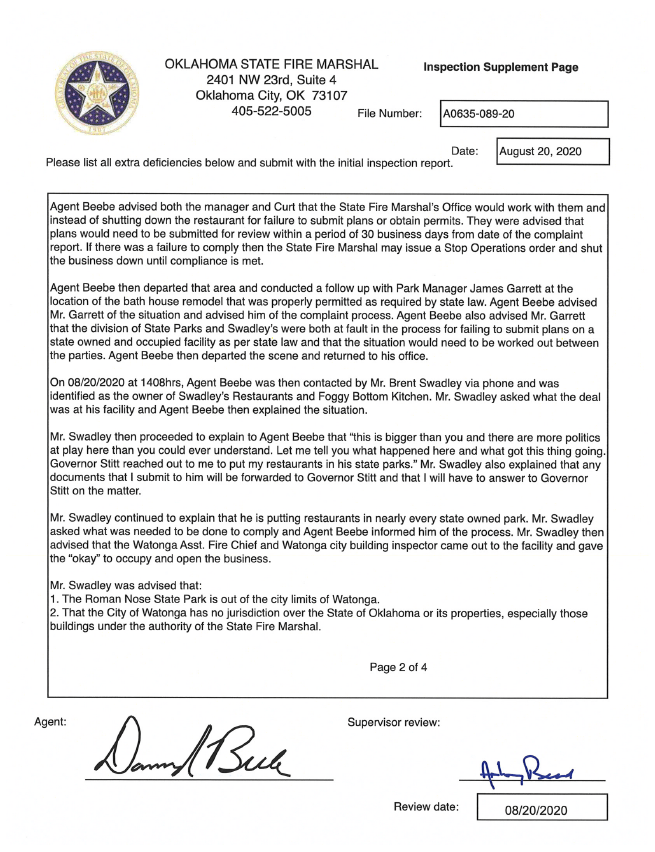 The report says, the vice president of Swadley's then told the agent that, "no permits had been applied for... and that they didn't submit plans on this restaurant or any of the other restaurants recently opened at state parks owned by the state of Oklahoma."