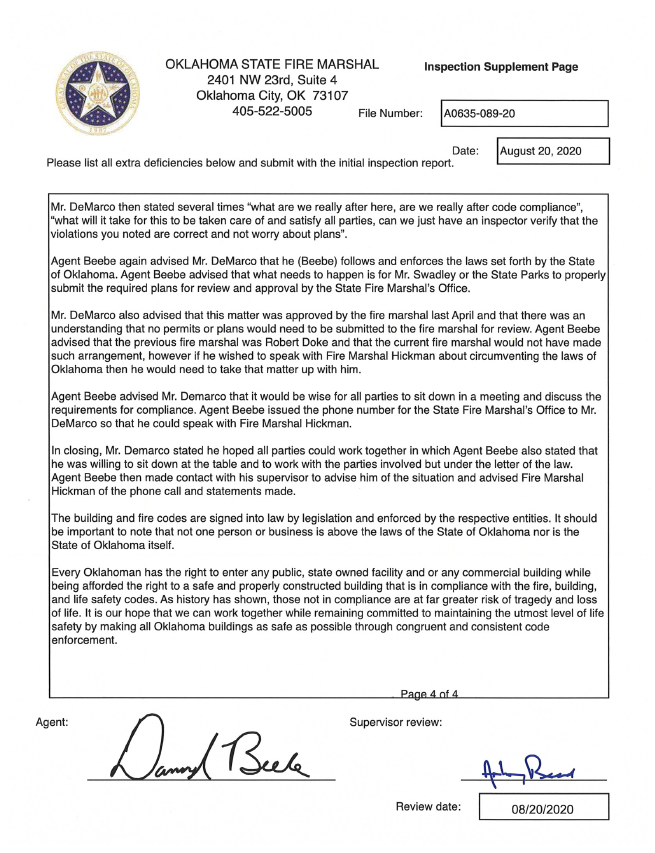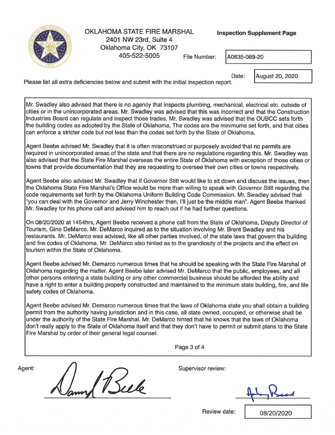 The report reads, "Mr. DeMarco hinted that he knows that the laws of Oklahoma don't really apply to the State of Oklahoma itself, and that they don't have to permit, or submit plans to the state fire marshal by order of their general legal counsel."