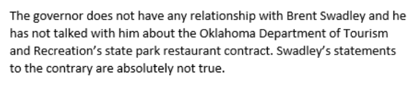 The agent says, "Mr. Swadley also explained that any documents that I submitted to him, will be forwarded to Governor Stit, and that I will have to answer to Governor Stitt on the matter."