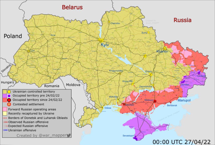 A map of the approximate situation on the ground in Ukraine as of 00:00 UTC 16/04/22.