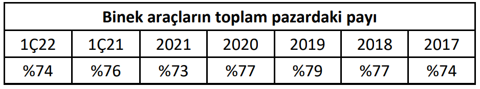 Yılın ilk çeyreğinde devam eden küresel çip tedarik sorunu kaynaklı araç bulunabilirliğinin azalması, üretim maliyetlerinde görülen artış ve döviz kuru hareketleri etkisiyle araç fiyatlarındaki yükseliş sebebiyle yurtiçi satışlarda daralma görülmüştür.