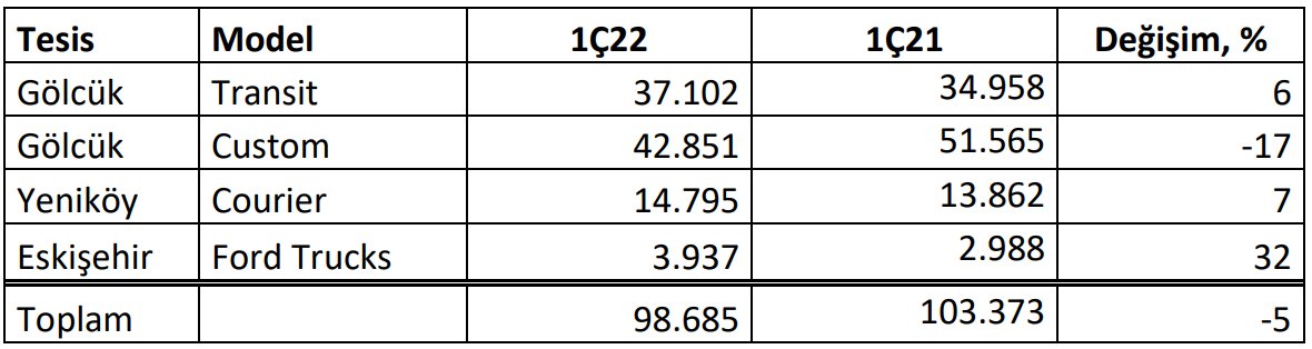 Ocak-Mart döneminde toplam üretim adedi yıllık bazda %5 azalmış ve 98.685 (Q1/2021: 103.373) adet olmuştur. KKO toplamda %84 (Q1/2021: %91), Gölcük Fabrikasında %83 ve Eskişehir Fabrikasında %84 olarak gerçekleşmiş.