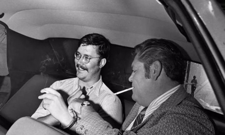Sonríe mientras un agente batalla para ponerle las esposas, luego de ser arrestado. Kemper era un tipo enorme e intimidante, por lo que imponía miedo a quien interactuara con el.