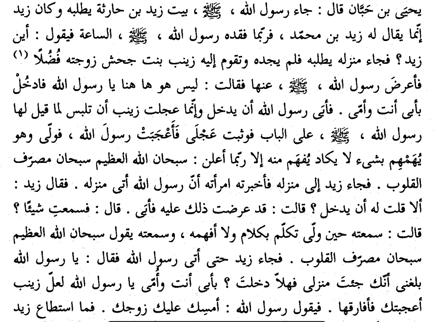 6. روزی پیامبر برای کاری به خانه زید رفت ولی زید در خانه نبود. پیامبر بیرون در منتظر بود و زینب در حالی که لباسش را درست نپوشیده بود با عجله به سمت پیامبر رفت. پیامبر در حال زمزمه "سبحان الله العظیم سبحان الله زیر و رو کننده قلبها" بازگشت. این عبارت را همه سیره نویسان نوشته اند.